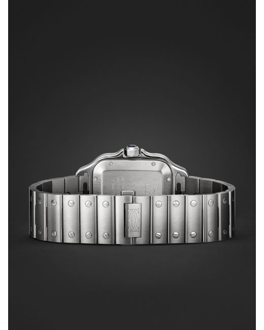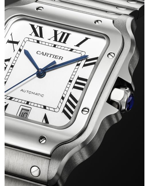 Cartier's 'Santos' watch was introduced in 1911 as the first timepiece specifically designed to be worn on the wrist and has since become one of the house's most iconic styles. This modern version of the revolutionary timepiece is Swiss-made from polished stainless steel and has a 39.8mm case with exposed screws, a silvered dial and blued steel sword-shaped hands. The house's 'Quick Switch' feature allows you to easily swap the strap yourself. For warranty information, please refer to details & care
