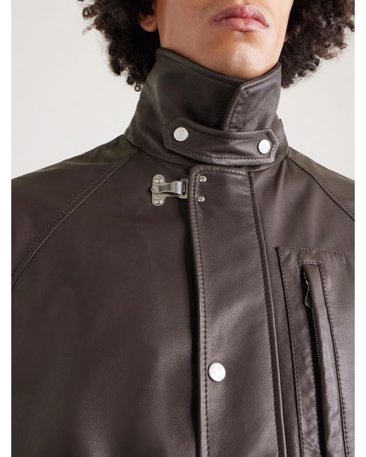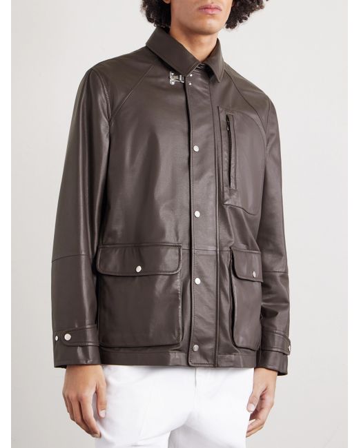 Brunello Cucinelli’s jacket updates outdoors heritage in supple leather, while keeping the functional touches that defined its inspiration. It features a panelled construction with a classic collar, throat latch, adjustable cuffs and three practical pockets.