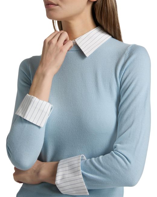 Alice + Olivia's Porla collared sweater is crafted from a stretch wool, complete with a versatile detachable collar and cuffs. Spread collar Long sleeves, detachable cuffs Back zip closure 99% wool/1% elastane Combo: 100% lyocell Dry clean Imported SIZE & FIT About 21" from shoulder to hem Model measurements: 5'10" tall Model is wearing a US size Small ABOUT THE BRAND Founder Stacey Bendet has been embracing bold color, eclectic prints and an overall passion for whimsy since launching Alice + Olivia in 2002. From party-ready dresses to statement tops and everything in between, she's created a playful and overtly feminine aesthetic that's uniquely her own. Contemporary Sportswear - Alice + Olivia > Alice + Olivia > Saks Fifth Avenue. Alice + Olivia. Color: Carolina Blue. Size: XS.