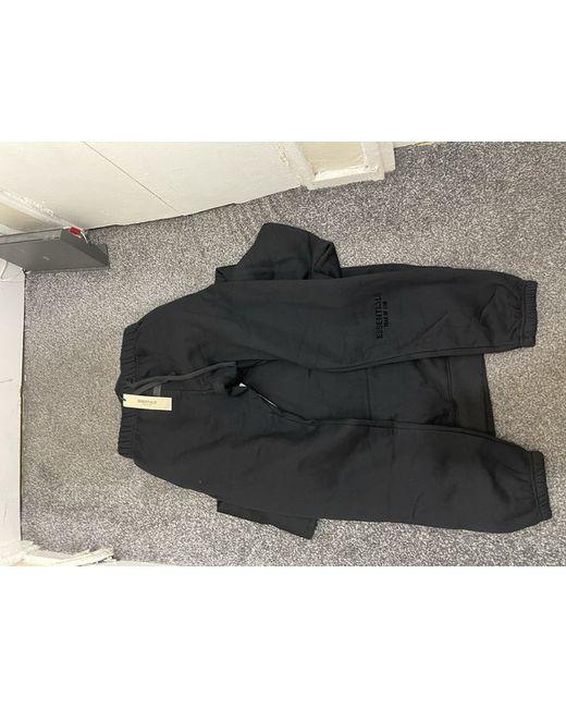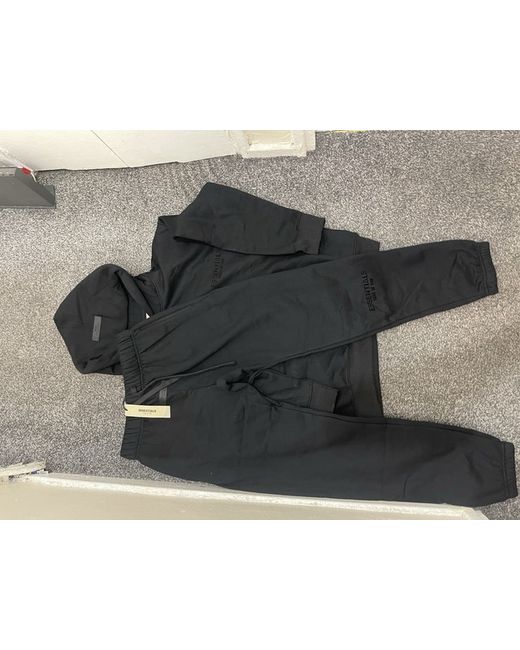 The Essentials tracksuit is a stylish and comfortable outfit perfect for activewear. Made from heavyweight cotton fleece, this 2-piece set includes a black hoodie with a logo accent, long sleeves, and a drawstring closure. The tracksuit is designed for winter activities like gym training, with a 30-inch inside leg and a regular fit. It is machine washable for easy care and is part of the designer theme by Essentials. Perfect for men looking for a sleek and practical athleisure outfit.