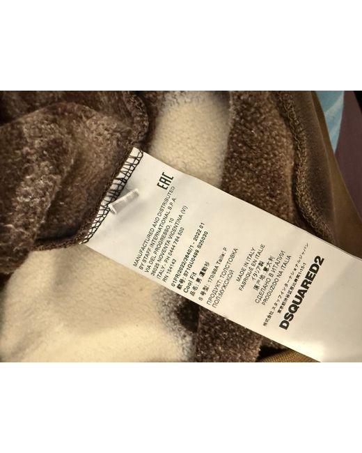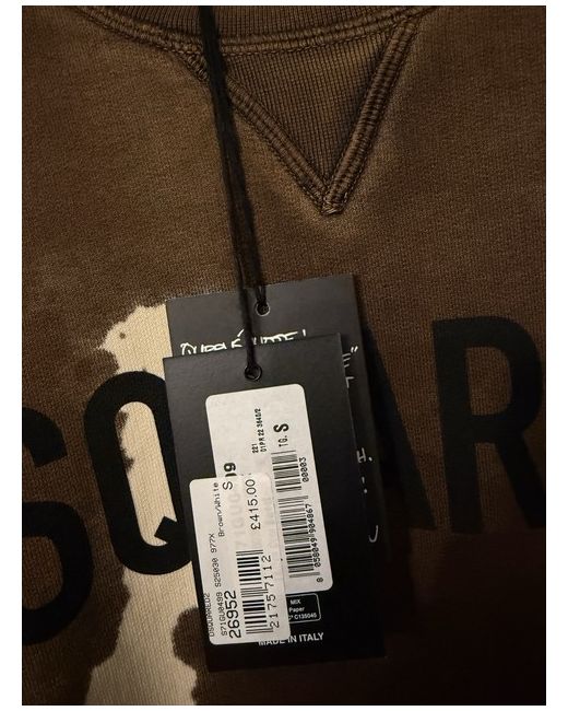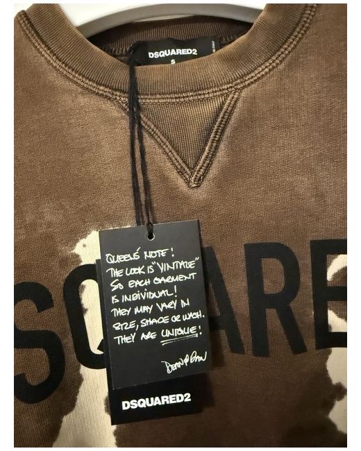 DSQUARED2 Logo Sweatshirt In Cognac Brown. An all over tie dye design in brown and White with a ribbed crew neck featuring a v panel below. Ribbed cuffs on the long sleeves and a stretch ribbed waistband. The signature DSQUARED2 logo is printed on the chest in tan brown. A fleece interior and top stitching in brown and beige. 98% Cotton And 2% Elastane. Made in Italy