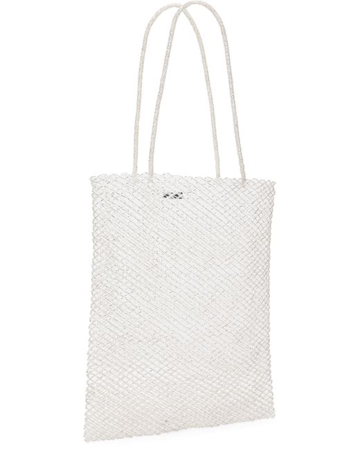 Handcrafted beaded mesh tote. · Fixed twin shoulder straps · Leather logo patch at face · Open throat · Unlined · H15 x W13 Supplier color: Silver
