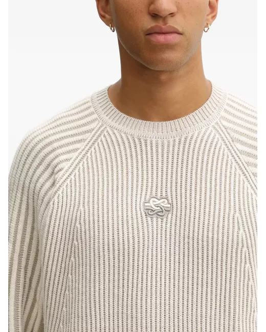 light beige ribbed knit crew neck long sleeves logo appliqué raglan sleeves