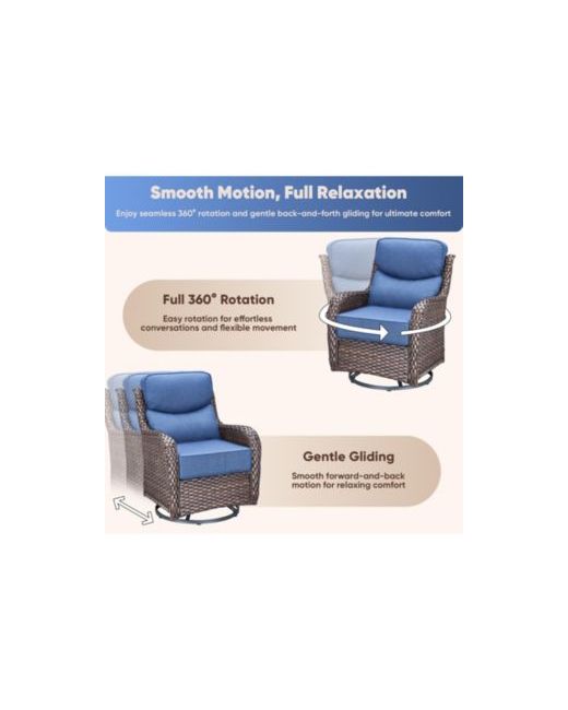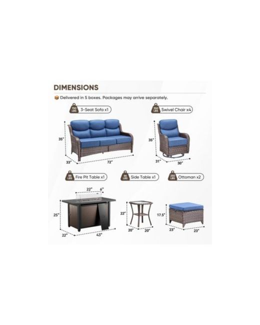 Blue Crescent Brown Wicker Fire Pit Conversation Set with Olefin 6 Thick Cushions Patio Swivel Chairs 9-Piece