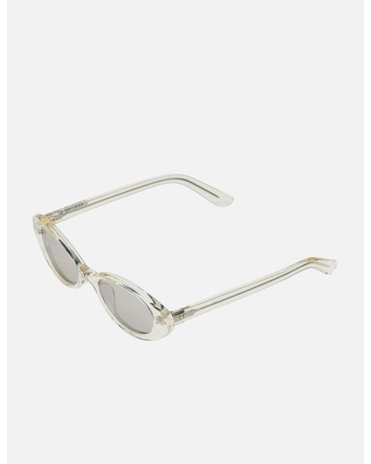 AkilaDaisyOval frameRounded edgesDouble-riveted hingeMetal temple coresRecycled nylon lenses100% UV protectionColor: Crystal / Grey