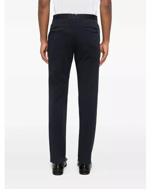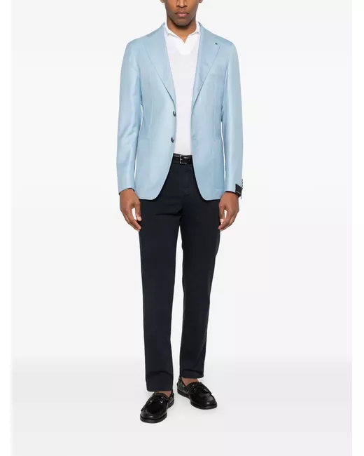 blue belt loops two side slit pockets two back welt pockets concealed fly fastening