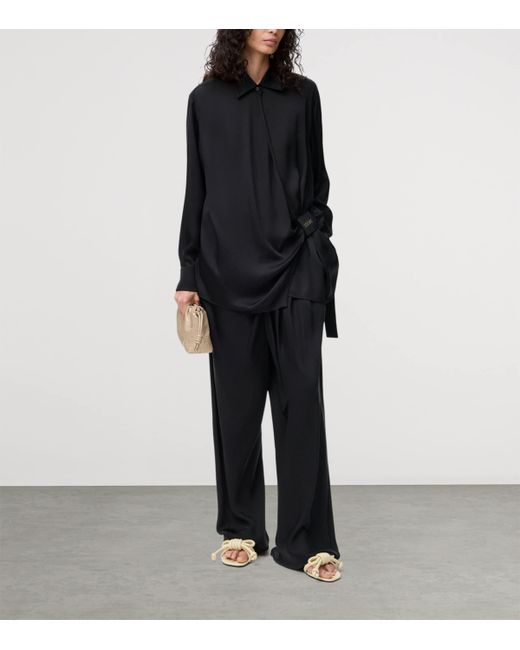 loewe's ability to manipulate fabrics and play with silhouette comes to life in its range of draped garments, including this shirt. The silk fabrication features voluminous pleats, then pools at the hip into soft gathers that meet at a debossed leather logo patch.