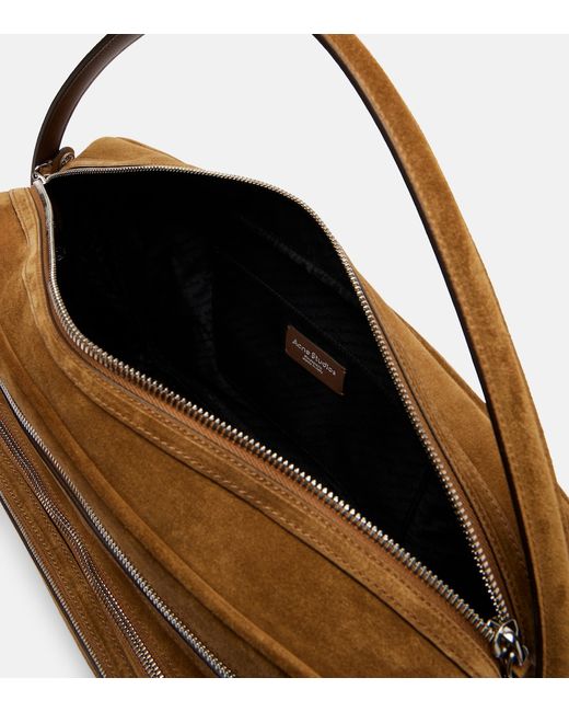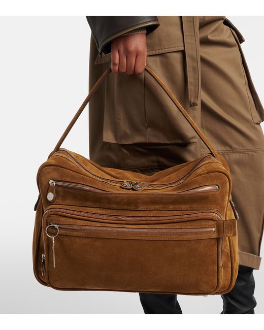 Material: leather (suede). Lining: fabric. Made in Italy. Designer color name: Cognac Brown. Zipped front and back pockets. Hardware color: silver. Closure: two-way zipped top. Detachable shoulder strap, Top handle. Protective feet. Detachable charm. Internal details: single compartment, internal slot pocket. Leather. Includes: dust bag.