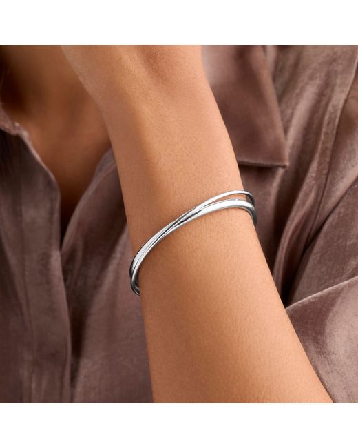 A true classic, this crossover bangle is designed to elevate your everyday style. Crafted in platinum plating, it features a unique overlapping design. A timeless addition to your jewellery box or a thoughtful gift for someone special, this piece is made to be loved for a lifetime. Wear it solo or stack it with our signature watches for a layered look. NEED TO KNOW Material: Platinum Plated Stainless Steel Five-year quality and plating guarantee Comes in luxury recyclable packaging Innovative anti-tarnish protective coating Water, sweat and heatproof Made from over 60% recycled materials Bangle size: 45-55mm