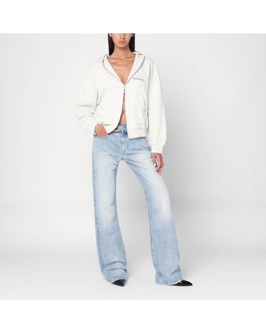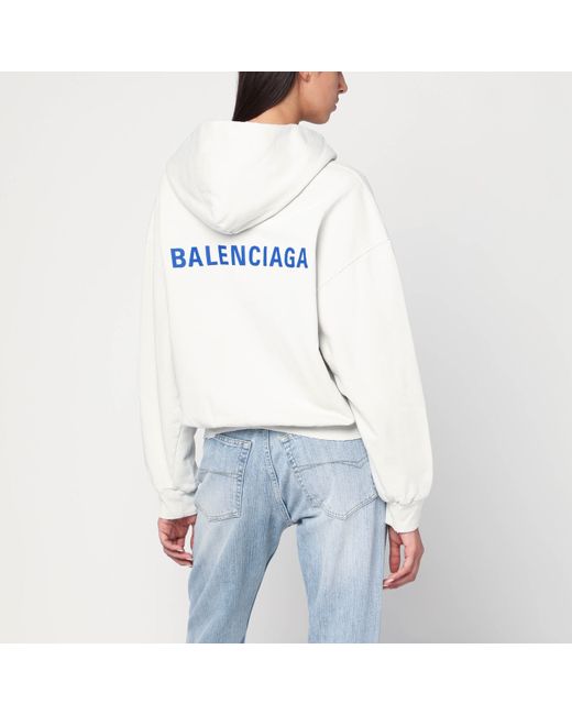 White cotton hoodie by Balenciaga, featuring long sleeves, a front kangaroo pocket, ribbed edges, distressed details, dropped shoulders, a front zip closure, contrasting logo lettering on the chest and back, and a regular fit.