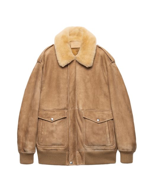 Unlined Regular fit Front zipper closure with snaps Shearling collar Fur type: Shearling Fur treatment: Dyed Fur origin: Spain Straight sleeve and ribbed knit cuffs Flapped patch pockets Ribbed knit hem Leather triangle logo on the back Imported 100% Sheep. Lsd Rtw - Prada Rtw > Prada > Saks Fifth Avenue. Prada. Color: Beige Multi. Size: 2.