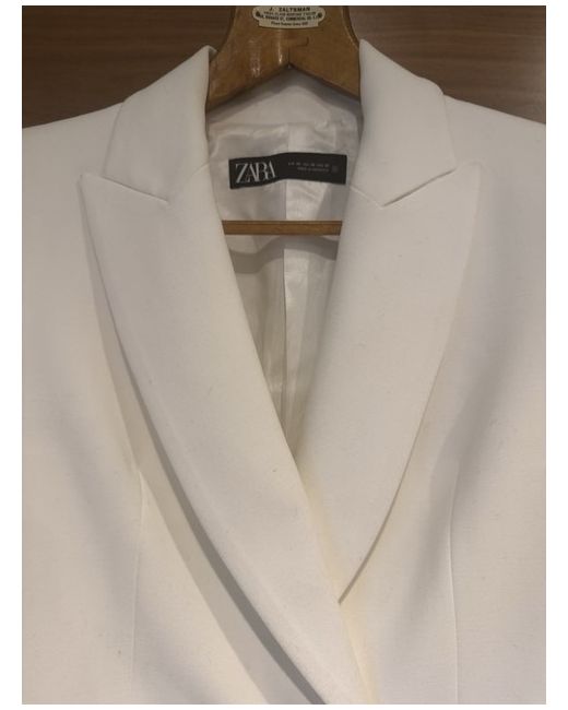 The blazer shown is a Zara cropped double-breasted blazer with gold-tone buttons, often described as "ecru" or "white". It has a round neck (or lapel collar depending on the specific model) and long sleeves with shoulder pads. Brand: Zara Style: Cropped, double-breasted blazer Color: White Features: Embossed or prominent gold-tone buttons, round or lapel collar, long sleeves, shoulder pads Material: Typical composition is a blend of polyester, viscose, and elastane It is brand new , never worn . Without tag. Please observe all the pictures for more details size Xs. Uk 6 -8