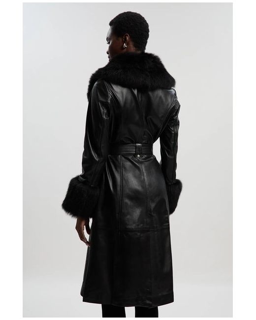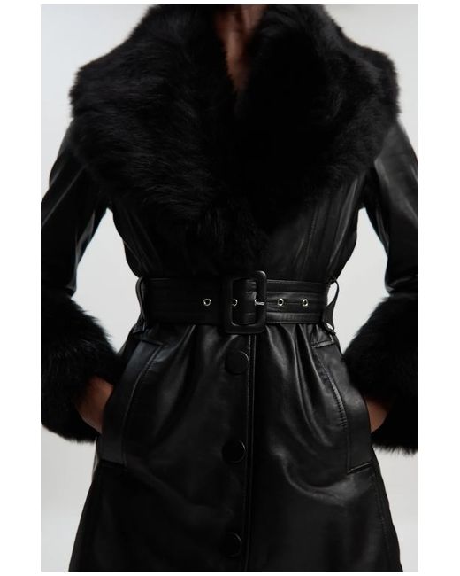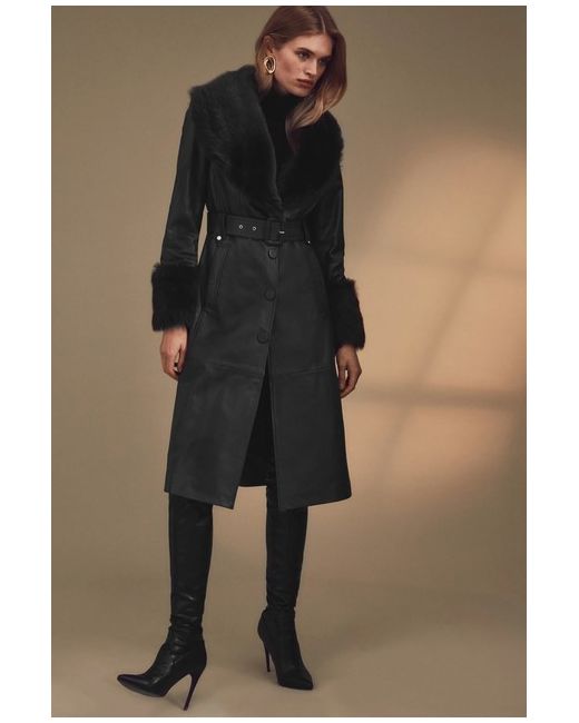 The sumptuous shearling collar and cuffs add a touch of opulence whilst maintaining a refined aesthetic. Shearling collar and cuffs Belted waist design Front button fastening Practical side pockets Regular fit with a mid-length cut.