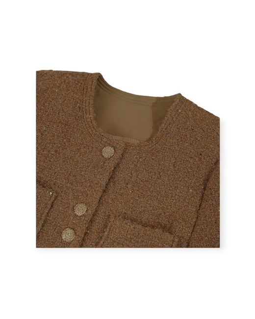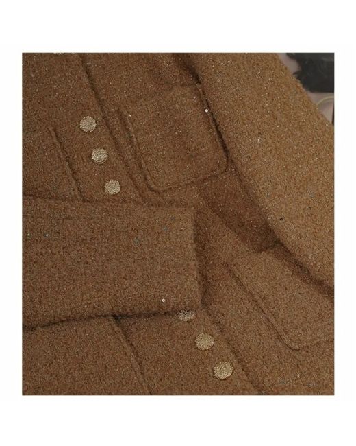 This handmade Camel Bouclé Wool Jacket with Sequin accents is a stylish and versatile addition to any wardrobe. The jacket features a classic tweed design, long sleeves, and a button closure. With a lined interior and made from wool insulation, it is perfect for all seasons and occasions, from casual outings to formal events. The subtle sequin detailing adds a touch of glamour, making it a standout piece for any designer-conscious woman. Made in the United Kingdom, this jacket showcases quality craftsmanship and timeless style.
