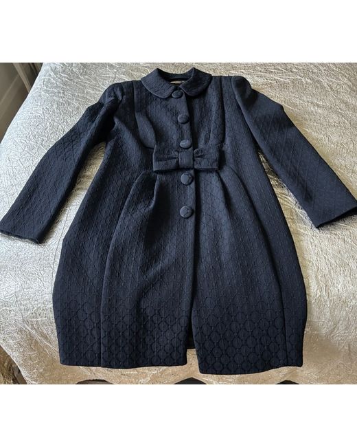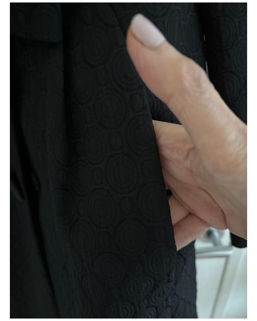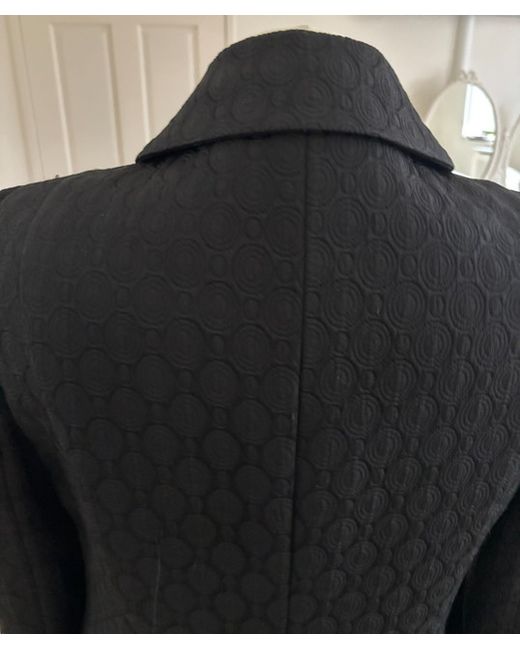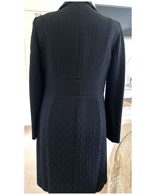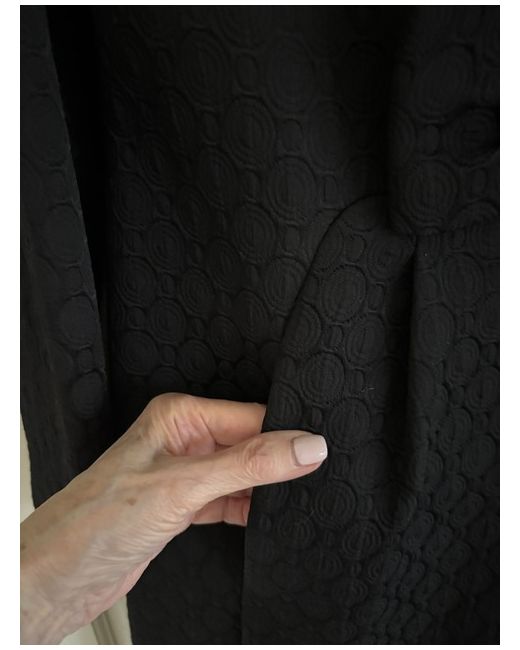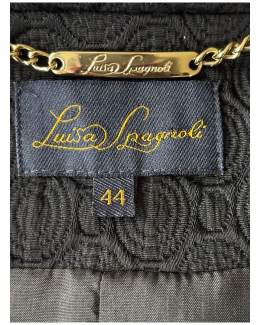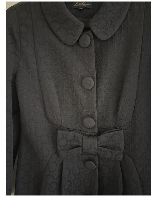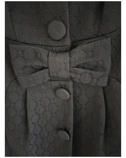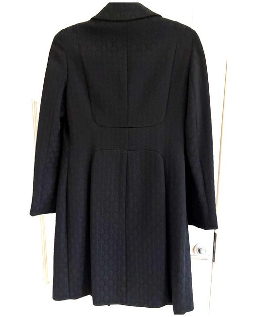 This product is a stylish black evening coat from designer Luisa Spagnoli. Made from a blend of polyamide, cotton, and acetate, the mid-length coat features a self-pattern, long sleeves, and a collared neckline with a button closure.