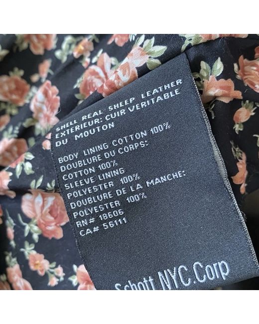 This is a Schott Bros (Schott NYC) black leather motorcycle jacket featuring a distinctive floral lining. Schott NYC is a well-known American brand famous for producing iconic leather jackets.