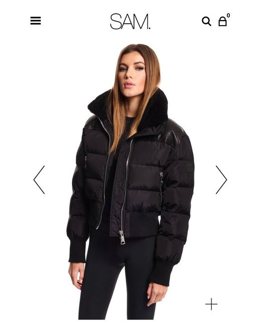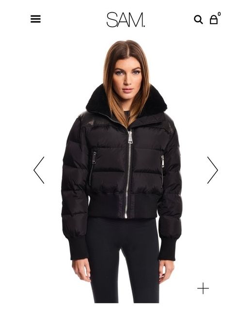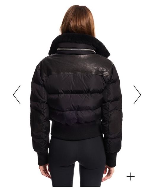 This quilted, down bomber jacket is crafted from a densely woven matte nylon, and filled with down to achieve warmth and an ultra soft feel. The Mini Sawyer is wind resistant and features a shearling stand collar with a zip that conceals a roll-out hood, a leather yoke, leather elbow patches, knit cuffs and waistband, a center front zip and snap placket closure, and lower zip pockets.