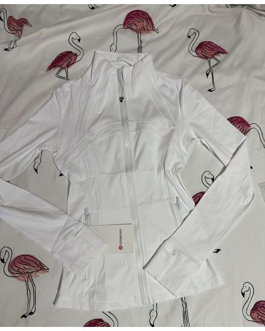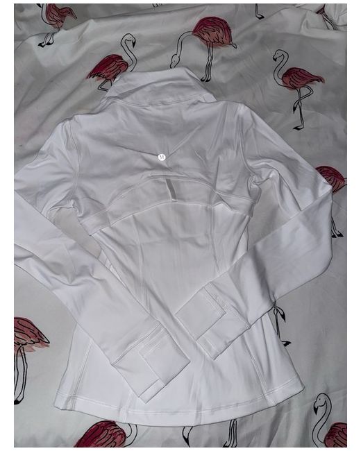 The Lululemon Women's Define Jacket in white is a versatile activewear piece made from a blend of nylon and polyester. With long sleeves, a zip closure, and machine washable fabric, it is perfect for yoga or other active occasions. The basic jacket style and size 6 fit make it a comfortable and stylish option for the spring season. Made by the reputable brand Lululemon, this jacket is a quality and fashionable addition to any woman's wardrobe.