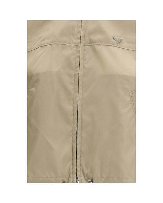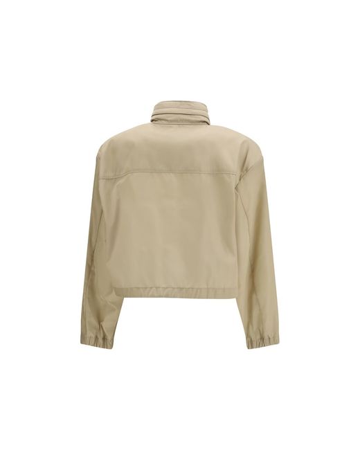 The Re-Nylon Jacket by Prada is a modern and functional garment made from high-quality technical fabric. The high collar with hidden zip and internal hood offer protection and comfort. The double-slider zip closure and two snap buttons ensure practicality and a perfect fit. The tone-on-tone enamel triangle logo adds a distinctive touch, while the two slanted front pockets offer useful storage space. The adjustable drawstring hem and long sleeves with elasticated cuffs complete the design. The cropped style gives it a modern and versatile look, ideal for a variety of occasions. Season: SS26 Fit: Regular Composition: 100% Recycled Polyamide