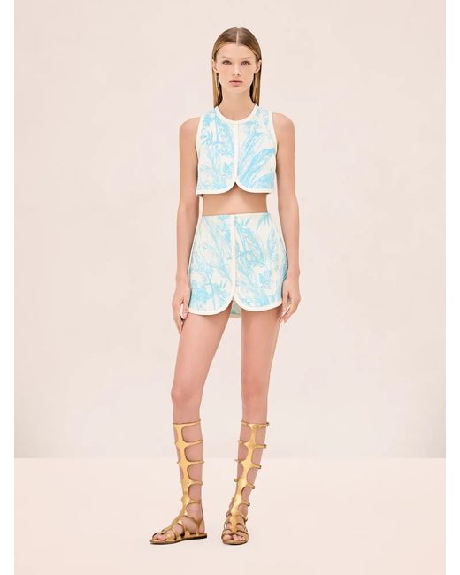 The Ola Top is a cropped jacquard top with a structured silhouette, paired with the Rayen Skirt.