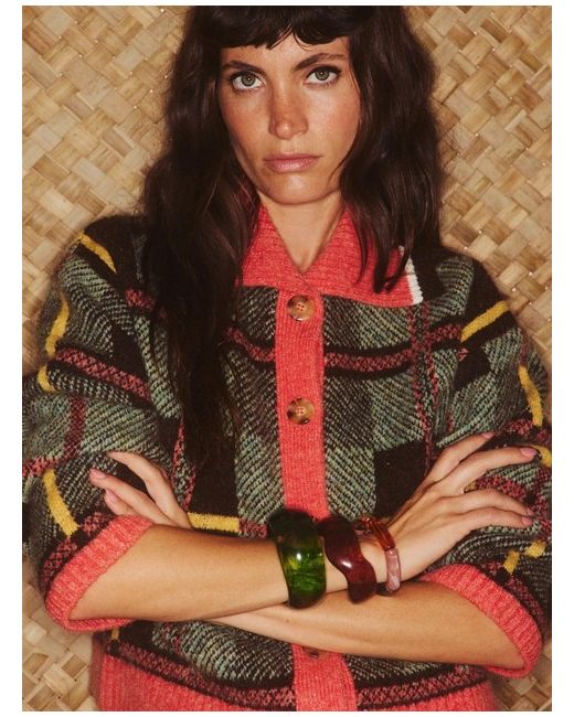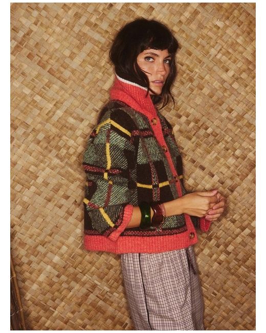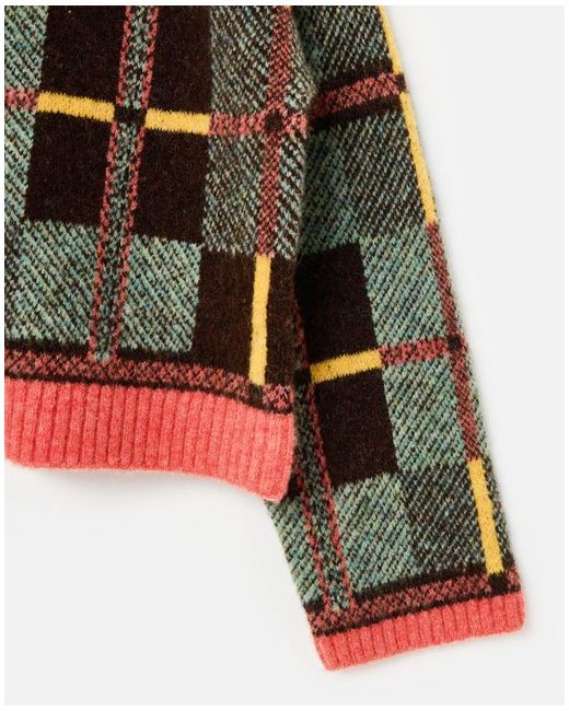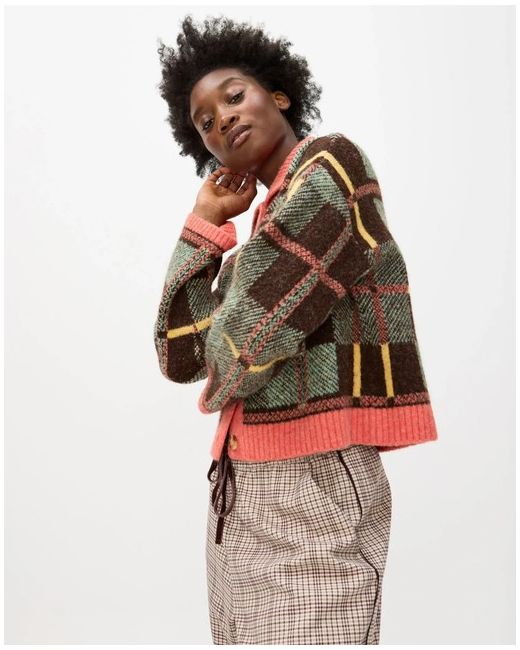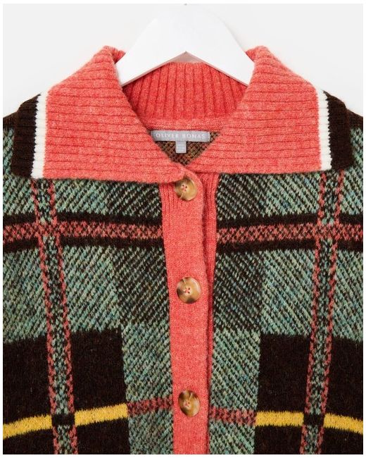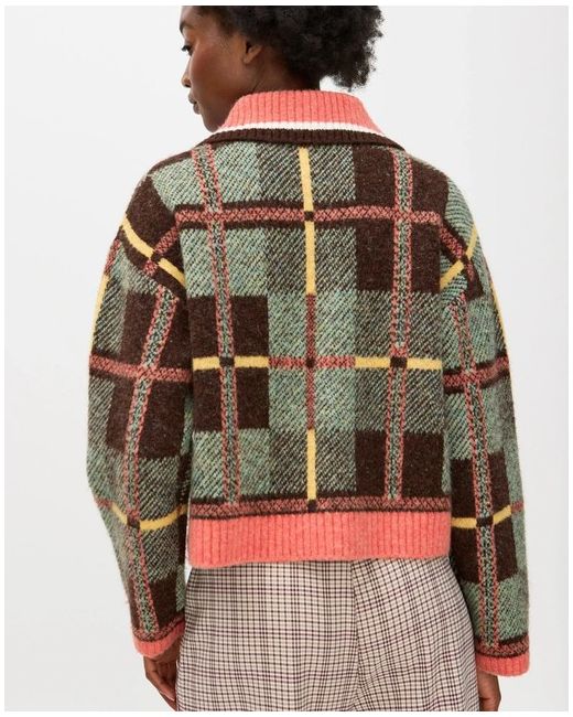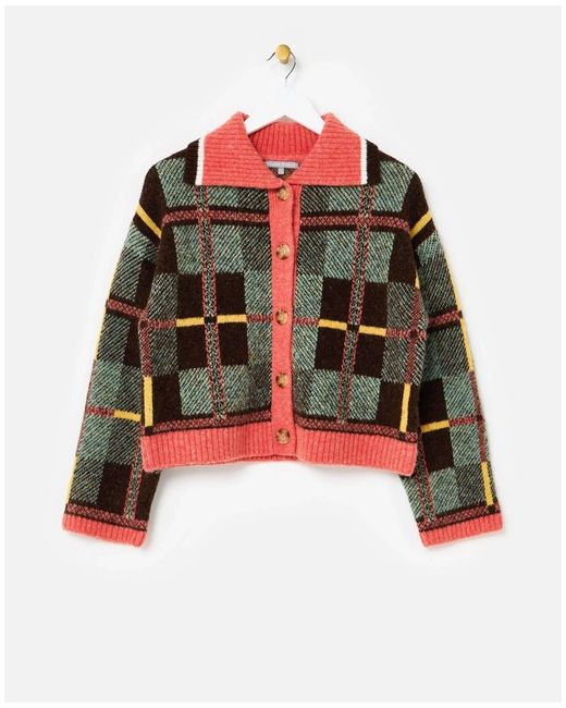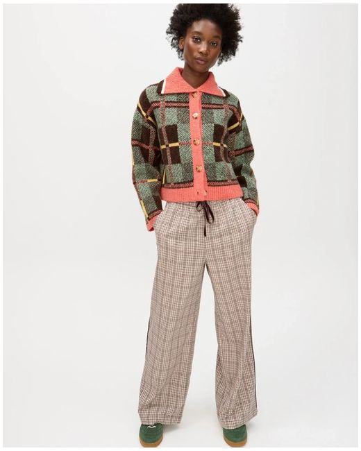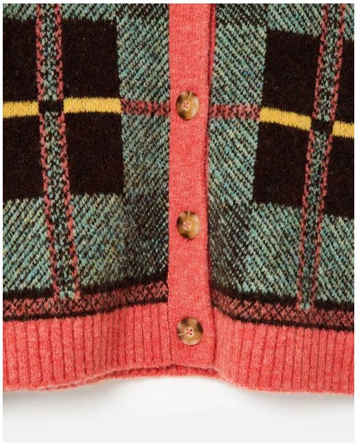 This knitted cardigan features a bold tonal green, brown and yellow checked pattern with a contrasting pink collar, placket and hem. Style: Cardigan. Machine washable. Fastening: Zip. There are brown faux tortoiseshell buttons down the front and ribbed trims.