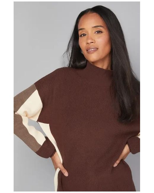 The high neck design creates an elegant silhouette while the ribbed texture adds visual interest and structure. The bold colour blocking on the sleeves creates a modern, artistic aesthetic that will refresh your autumn-winter wardrobe.
