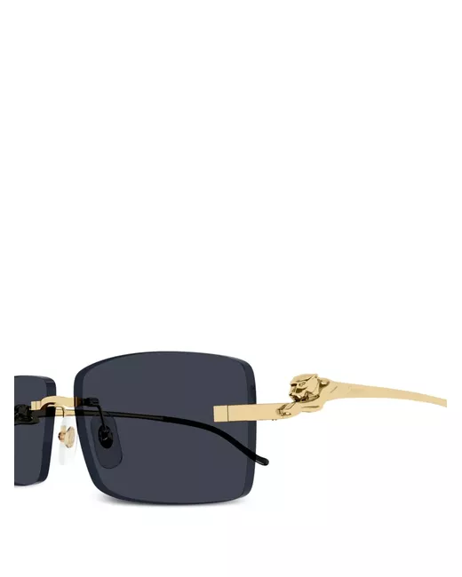 gold-tone metal frame rimless lenses grey tinted lenses rectangle frame nose pads signature panther plaque at the arm straight arms curved tips These glasses come with a protective case.