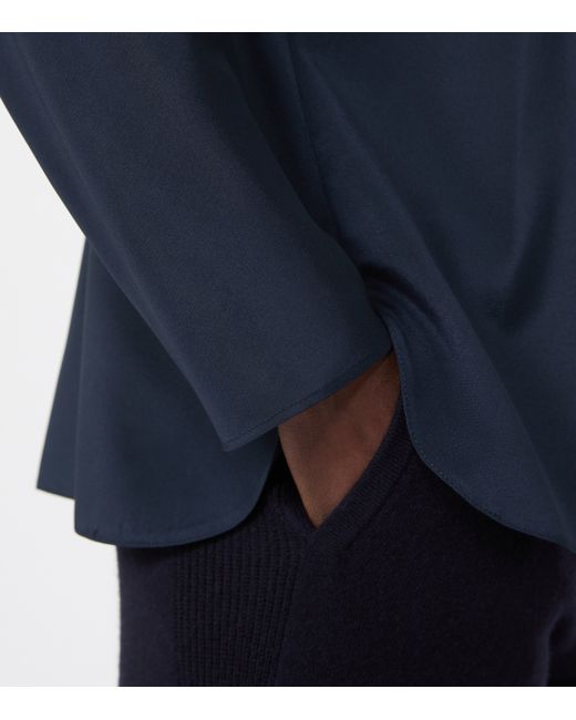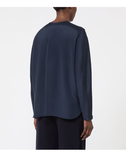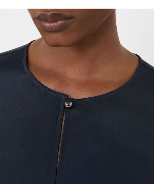 Minimalist design meets premium textile in this Max Mara stretch-silk blouse, featuring a sleek, collarless round neckline. The vertical split at the front is anchored by a solitary polished button, creating a sharp and authoritative focal point for a sophisticated professional or evening ensemble.