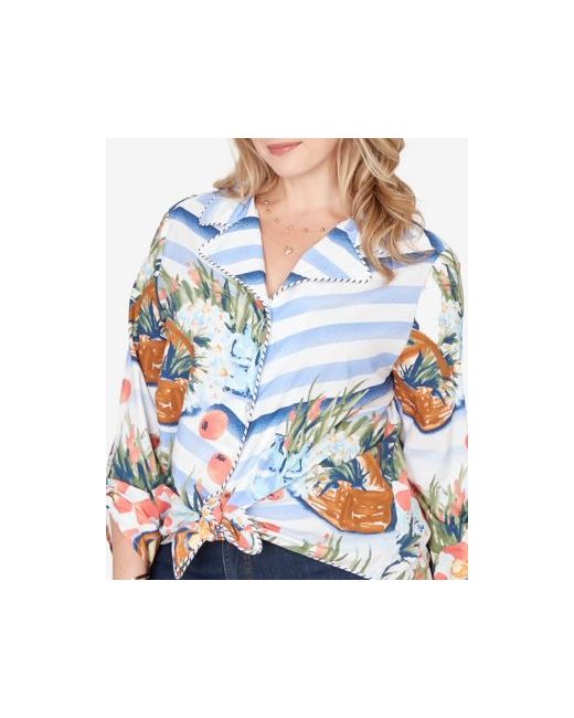 Brighten up your look with this soft poplin top featuring our picnic-inspired conversational print. Designed with a collared neckline, snap front, and a charming tie-front hem, it's finished with contrast tipping details and roll-tab sleeves for a polished casual look.