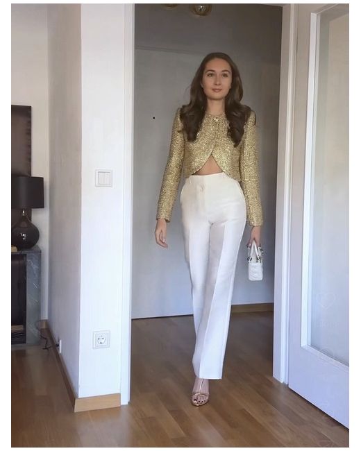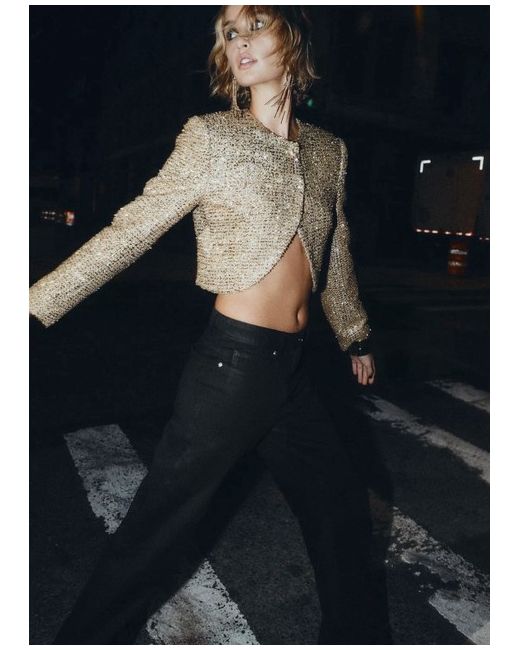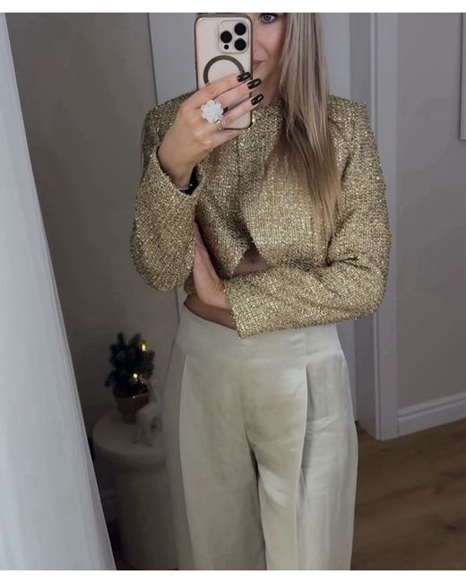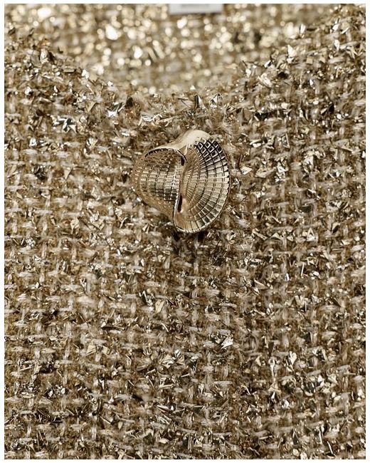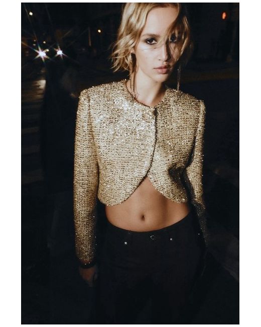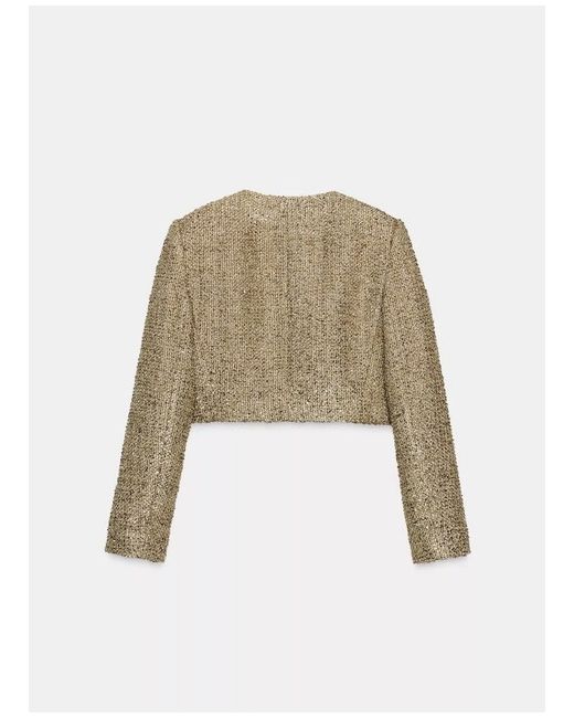 Round neck, long sleeve jacket with shoulder pads. Textured fabric detail with metallic thread. Front button fastening. GOLDEN SIZE S UK 8