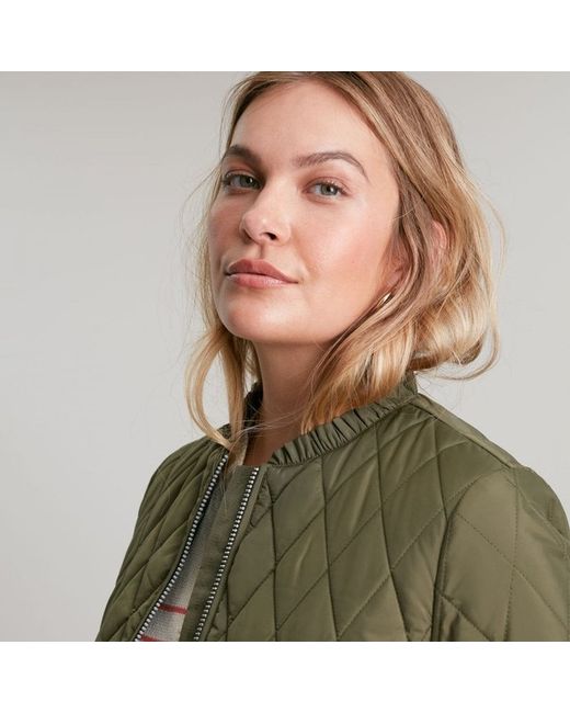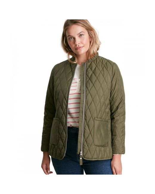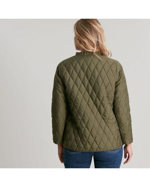 It features diamond quilting for that classic countryside look but is cut to a contemporary shape and finished with ruffle neck detailing. The outer is made from 100% recycled polyester and uses a showerproof fabric which is water repellent.