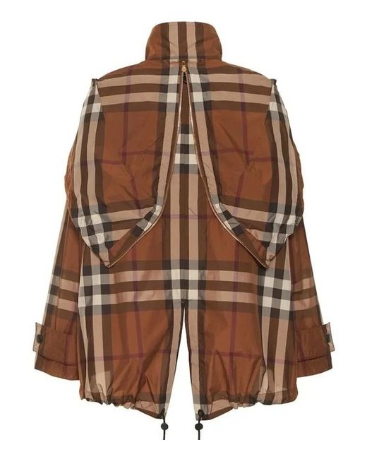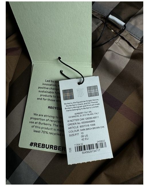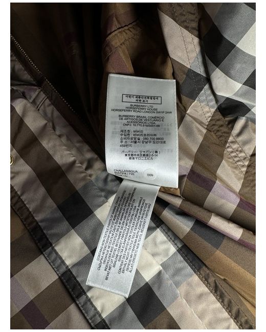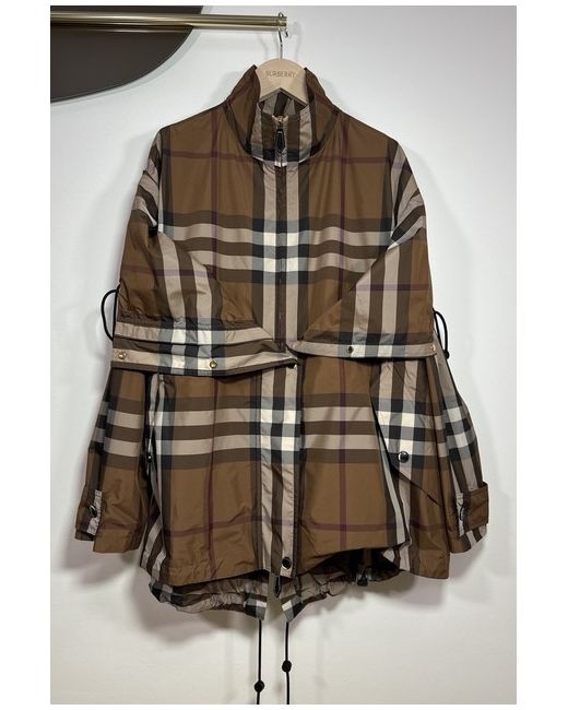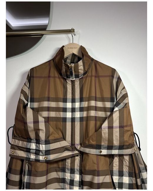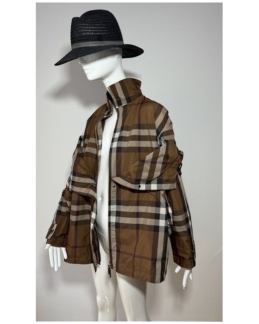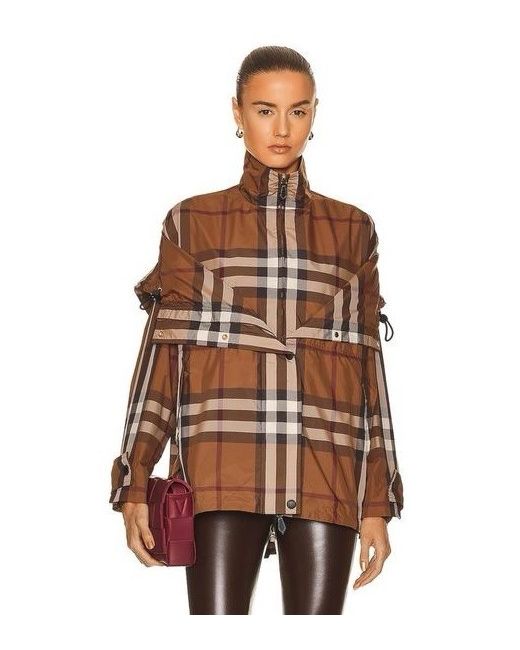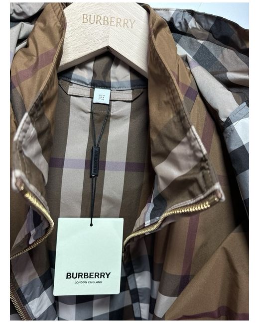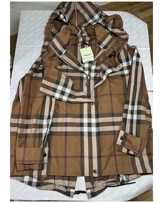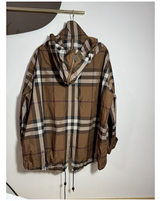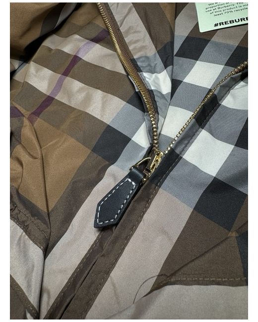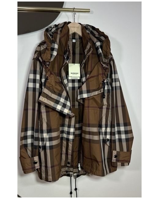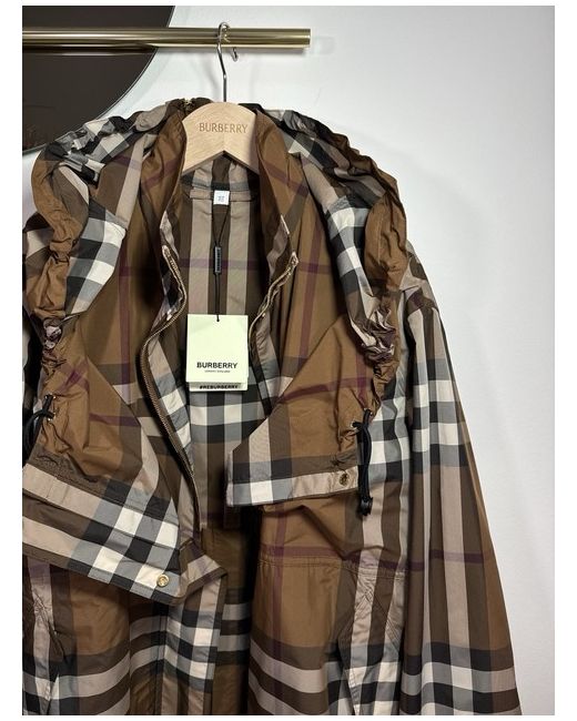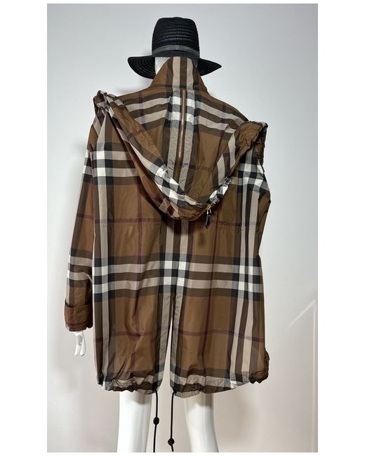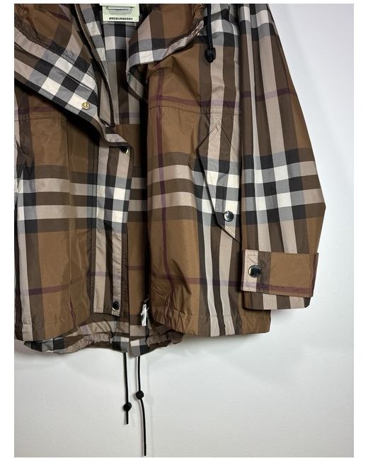 Dark birch brown check jacket from Burberry. Composition: 100% Polyester. zip Hood with zip Long sleeves. Funnel neck Hem and hood with drawstring Leather zip. Size UK 10. Sleeves Length 58 cm. Back Length 77 cm.