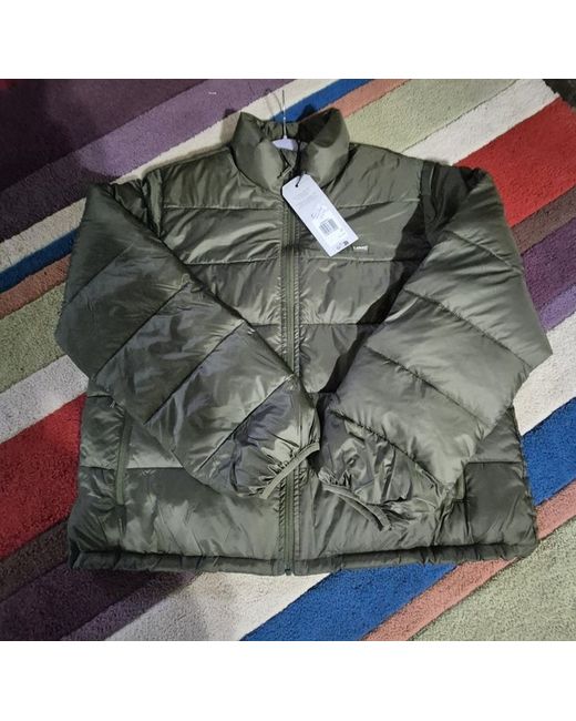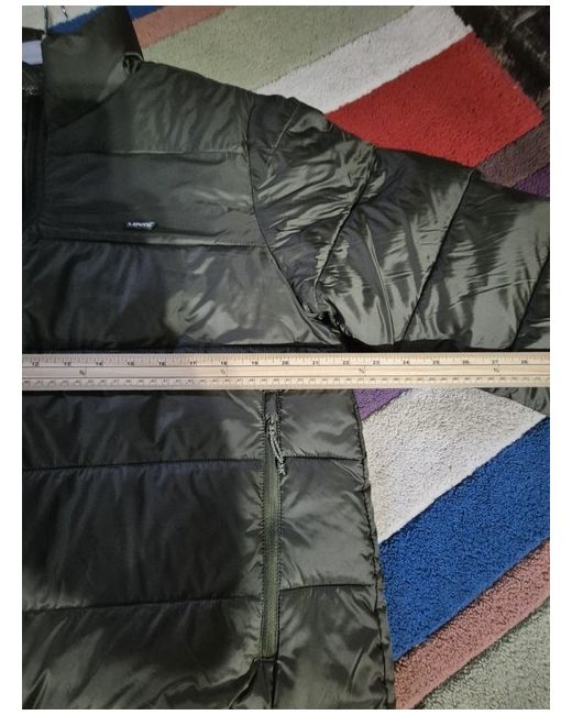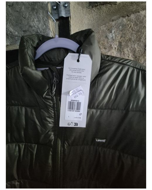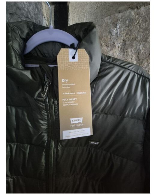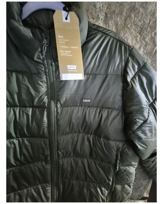 The Levis Olive Green Packable Poly Jacket in size L is a stylish and practical unisex bomber jacket made from polyester. This regular fit jacket features a classic bomber style in a sophisticated olive green colour, making it a versatile addition to any wardrobe. With its packable design, this jacket is perfect for on-the-go use and can be easily folded and stored when not in use, making it ideal for outdoor activities or layering up in cooler weather.