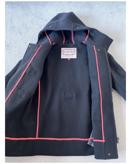 The Hunter Original Duffle Coat Jacket in black is a stylish and practical choice for women. Made from 80% wool, this long-sleeved jacket features a hood and zip & hook & eye closure, making it perfect for outdoor activities in all seasons. The classic duffle coat style, combined with modern accents like buttons and a logo, adds a touch of designer flair. Ideal for travel, parties, casual outings, or formal events, this regular fit jacket is versatile and on-trend, reflecting a country-inspired yet urban aesthetic.