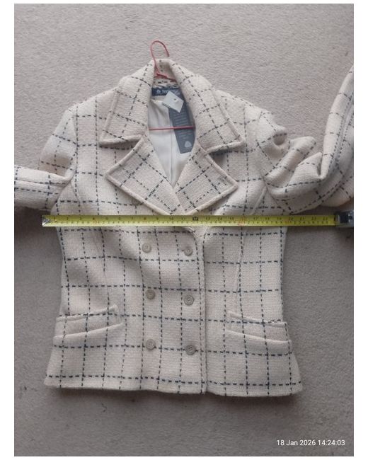 Very good quality, heavy, check double breasted wool jacket. Had it in the back of a cupboard for many years but never worn. Size label says 'L'. Could be described now as 'vintage'. See photos for measurements.