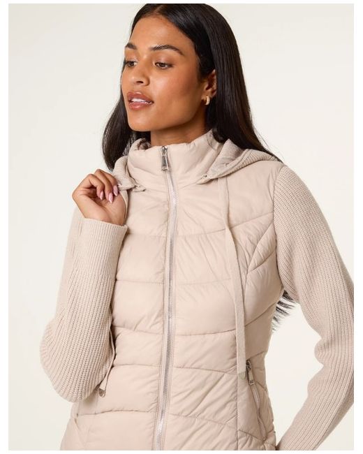 Lift your outerwear selection by wearing this clean and minimal knitted sleeve and hood puffer jacket. Team with jeans and brown over the knee boots. Shell: 100% Nylon Knitting: 100% Polyester Lining: 100% Polyester Made in China Dry clean only Long sleeve Zip pocket front Adjustable hood Zip front Model wears a size S: Model height: 5ft 10 / 178cm