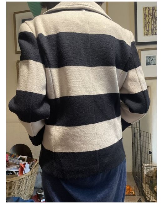 This Fenn Wright Manson Striped 100% Wool Double Breasted Jacket in size 14 is a stylish and versatile addition to any woman's wardrobe. In a classic blue and ivory striped pattern, this short length jacket is perfect for casual occasions, with its lined interior providing comfort and warmth. Made by the reputable brand Fenn Wright Manson, this basic jacket is a timeless piece that can be worn for years to come.