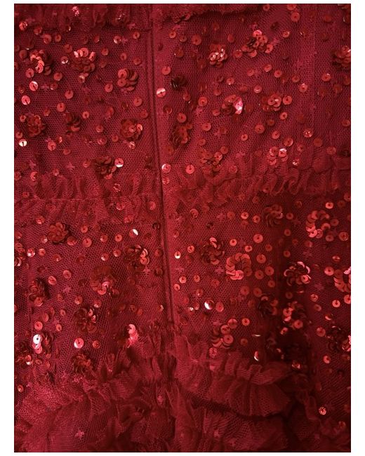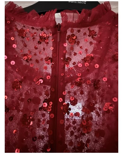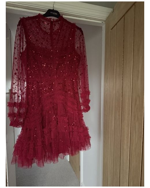 Bought this to wear to an event but chose something else. It’s a lovely dress, a deep red colour and the sequins really shimmer. A size 12, no stretch. The skirt is lined with a petticoat so it really swishes and looks great. I’m 5 foot six and the dress is just above my knees. So it’s short but not super short. Any questions please ask. Thanks for looking.