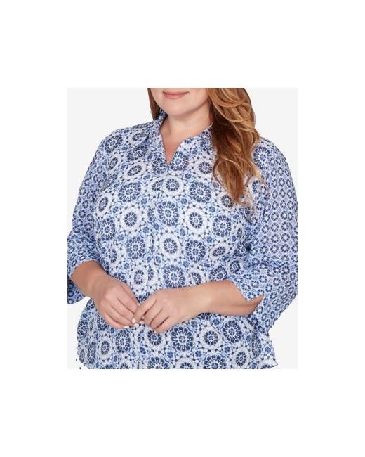 A modern play on pattern, this collared top showcases twin geometric motifs arranged in striking symmetry. Button-front styling and three quarter sleeves lend timeless structure, while the rounded hemline ensures effortless wear. A versatile piece, it layers polish and artistry into one.