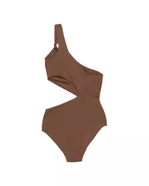 brown cut-out detail ring detail one shoulder ruched detail high cut Be mindful to try on swimwear over your own garments.