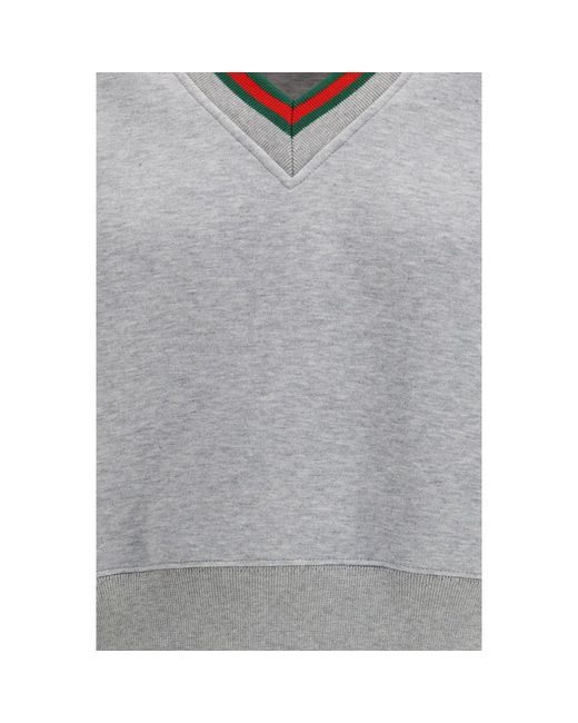The Web cotton jersey Sweatshirt by Gucci is a casual-chic piece crafted from soft light gray cotton jersey. The Web motif, an iconic symbol of the fashion house, adorns the trim, adding a distinctive and recognizable touch. The V-neck and long sleeves complete the design, offering a comfortable and modern fit. Perfect for those looking for a casual style with a touch of luxury, this sweatshirt is ideal for a sporty yet elegant look. Season: SS26 Fit: Regular Composition: 100% Cotton