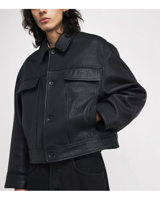 Studio Nicholson's Doyard jacket is a luxurious reinterpretation of the classic trucker, designed to become a true wardrobe pillar. Cut from carefully selected lamb leather with an exaggerated textured grain, and is shaped to a cropped profile that sits just above the waist, accentuating the slightly boxy fit for a structured yet relaxed silhouette.
