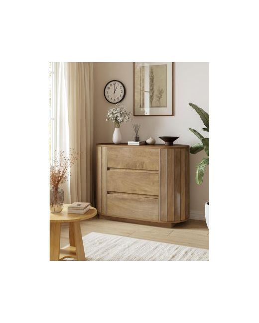 Its design features clean lines, a warm oak-toned finish, and distinctive slatted side panels that add texture and contemporary flair. The rounded corners and edges contribute to a safe, sleek look that integrates effortlessly into modern, minimalist, or transitional bedrooms, nurseries, or even entryways.