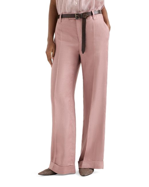Linen diagonal loose flared trousers with monili. Zip closure with metal hook and backing button Slanted front pockets Back welt pockets Cuffed hem Nickel-free monili decoration Request dry cleaning at specialist cleaner's only, do not bleach. Do not tumble dry, iron at low temperature 100% linen Made in Italy. Lsd Rtw - Brunello Cucinelli Rtw > Brunello Cucinelli > Saks Fifth Avenue. Brunello Cucinelli. Color: Pink. Size: 4.