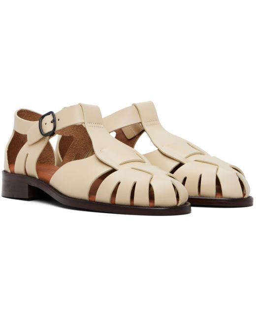 Polished calfskin fisherman-style sandals. · Cutouts throughout · Closed toe · Pin-buckle ankle strap · Calfskin suede lining · Topstitching at welt · Stacked block heel with rubber injection · Calfskin sole Supplier color: Custard