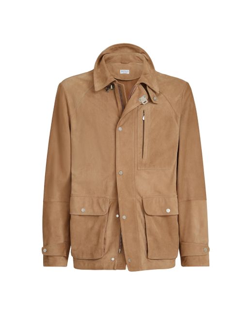 Suede unlined field jacket. Double closure with zip and snaps Shirt-style collar Snaps at cuffs Upper pocket with zipper Patch hand pockets with flap and button Unlined Two interior pockets Go to specialized facilities for cleaning. Do not dry clean. Do not bleach, do not tumble dry. Iron at low heat 100% real leather Made in Italy. Lsd Rtw - Brunello Cucinelli Rtw > Brunello Cucinelli > Saks Fifth Avenue. Brunello Cucinelli. Color: Light Brown. Size: Medium.