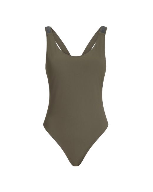 Techno jersey bathing suit with precious details. Nickel-free monili decoration Hand wash only, do not bleach. Do not tumble dry, iron at low temperature 68% Nylon, 32% Elastane Made in Italy. Lsd Rtw - Brunello Cucinelli Rtw > Brunello Cucinelli > Saks Fifth Avenue. Brunello Cucinelli. Color: Military. Size: 6.