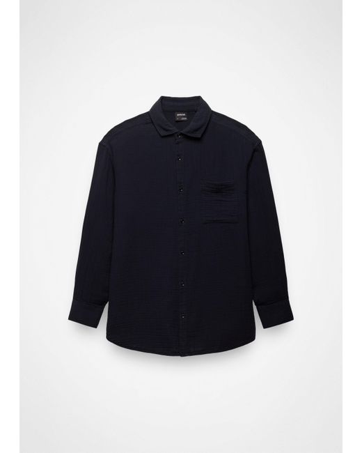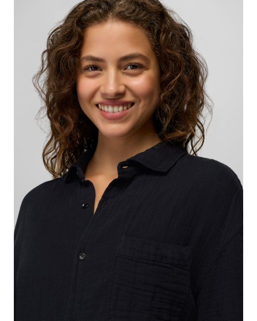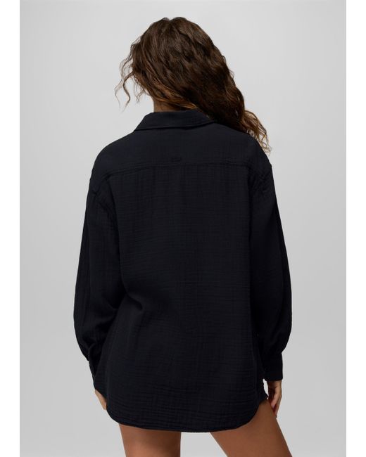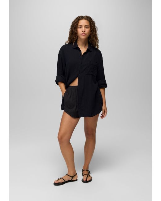 An oversized organic cotton button-down with a breezy, relaxed fit for layering over swimsuits or out and about on sun-soaked days. An effortless coverup for layering over your favorite swimsuit, the Hideaways Button Down Top is an easy go-to whether you’re lounging poolside or watching the waves on the beach. The ultra-soft, 100% organic cotton gauze fabric is lightweight and breathable, making this flowy, oversized button-down a packing-friendly, versatile coverup for tropical getaways and sun-soaked summer days. | Womens prAna Hideaways Button Down Top in Black, Size Large