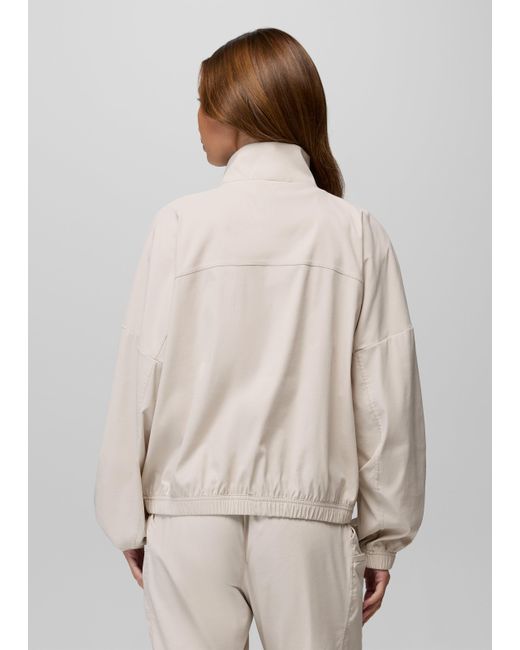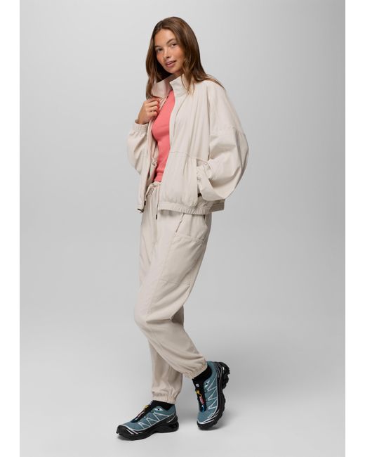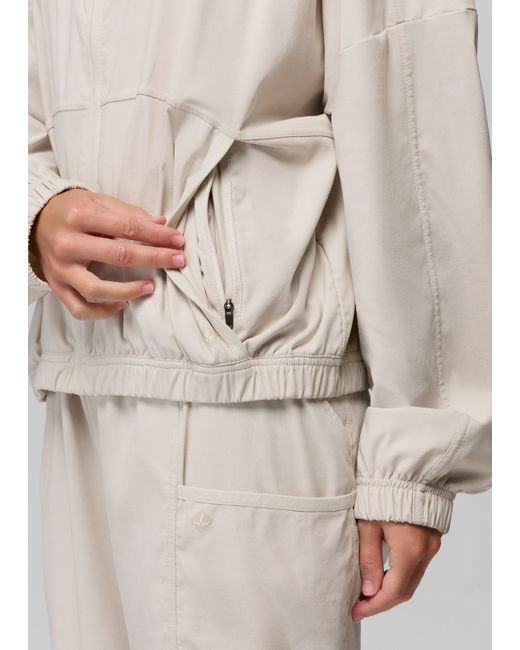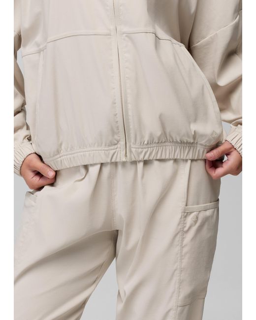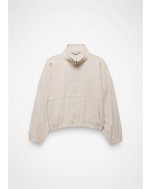 A sporty, lightweight jacket with water-resistant properties that keeps up with busy days and active moments. To, from, and everywhere in between — the Send Off Full Zip is a lightweight jacket that’s made for layering on and heading out. Made in durable recycled nylon with light water resistance, it’s designed with a drop shoulder and cinched elastic hem for style points, while the zippered pockets securely hold your essentials while you’re on the go. Pair with the Send Off Short or Jogger for a sporty set. | Womens prAna Send Off Full Zip in Light Gray, Size Large