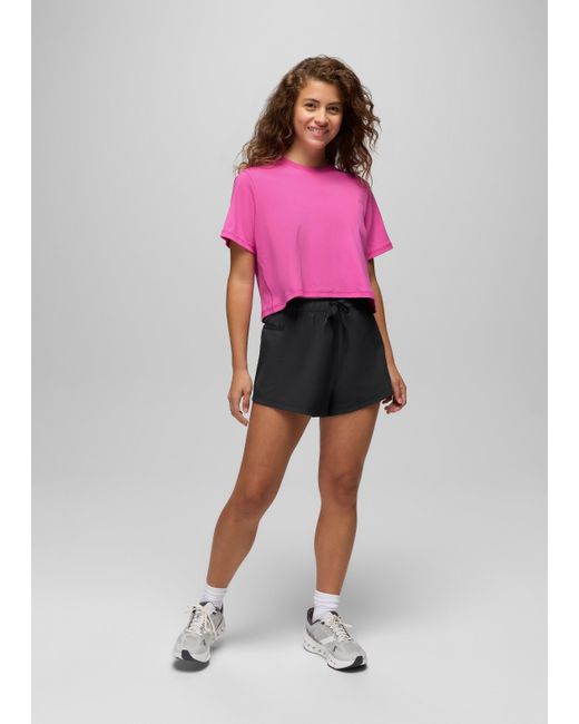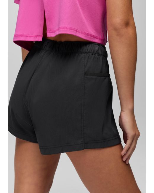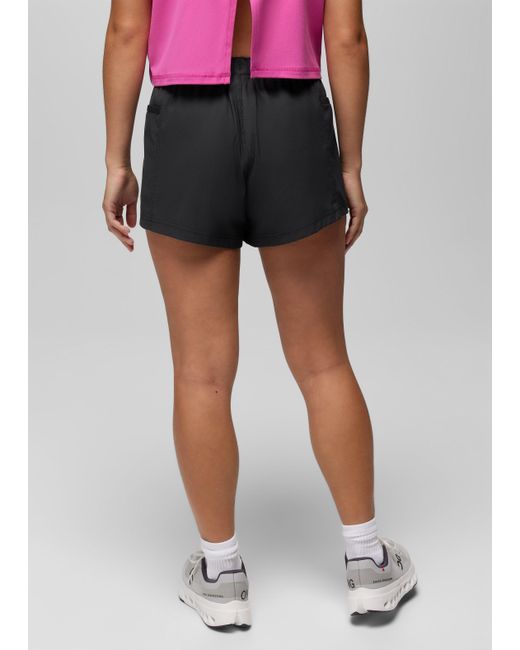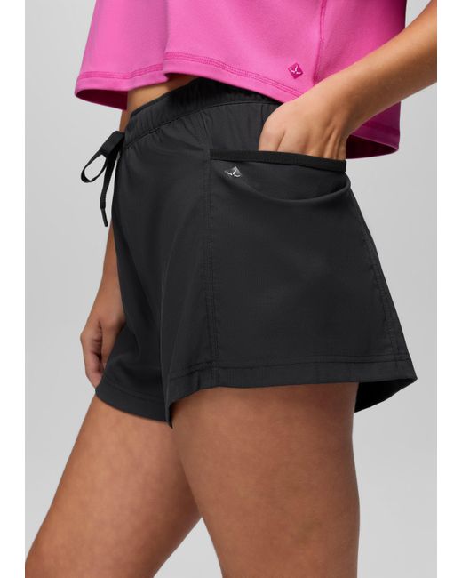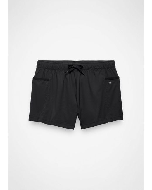 A sporty mid-rise short made in lightweight recycled fabric with stretch for free movement and all-day comfort. The Send Off Short is a lightweight, mid-rise bottom for active moments and comfortable summer outfits. The elastic waistband has an adjustable drawcord for the perfect fit, while the recycled woven fabric has a touch of stretch for maximum mobility while you’re on the go. Side pockets, a 3-inch inseam, and a relaxed fit round off the features with effortless style. Pair with the Send Off Full Zip for a sporty set. | Womens prAna Send Off Short in Black, Size Large